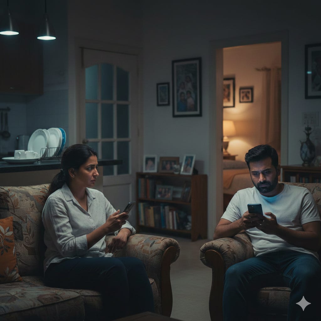 Aarti sits on the sofa, pretending to scroll, but her thumb isn’t really moving.